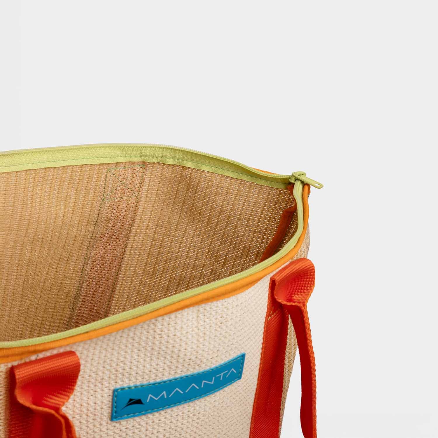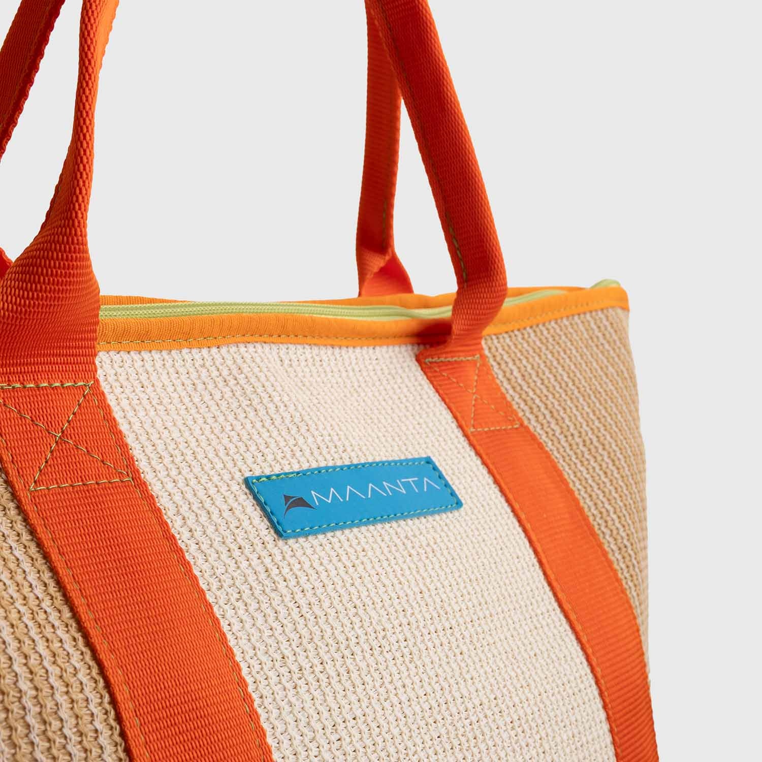 Dvoubarevná plážová taška s oranžovými vložkami a zelenými a modrými detaily, pohodlnými látkovými držadly, zapínáním na horní zip.