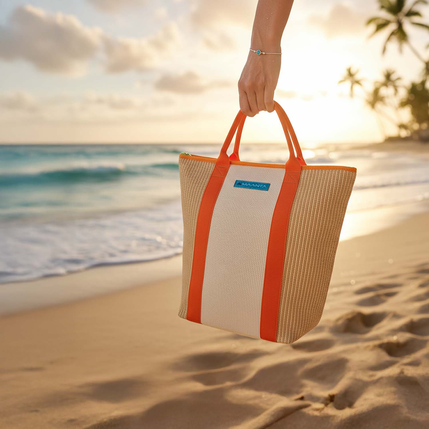 Dvoubarevná plážová taška s oranžovými vložkami a zelenými a modrými detaily, pohodlnými látkovými držadly, zapínáním na horní zip.