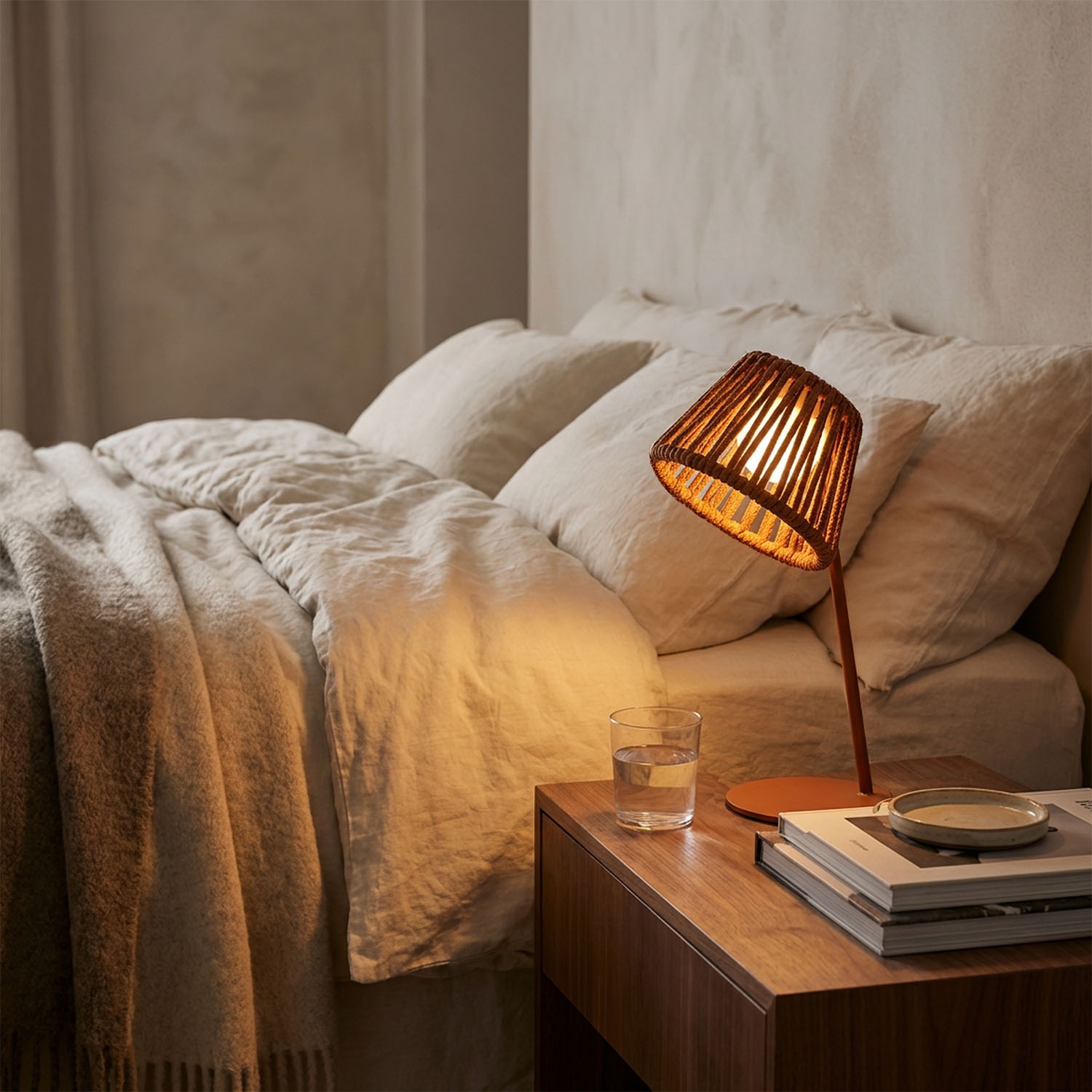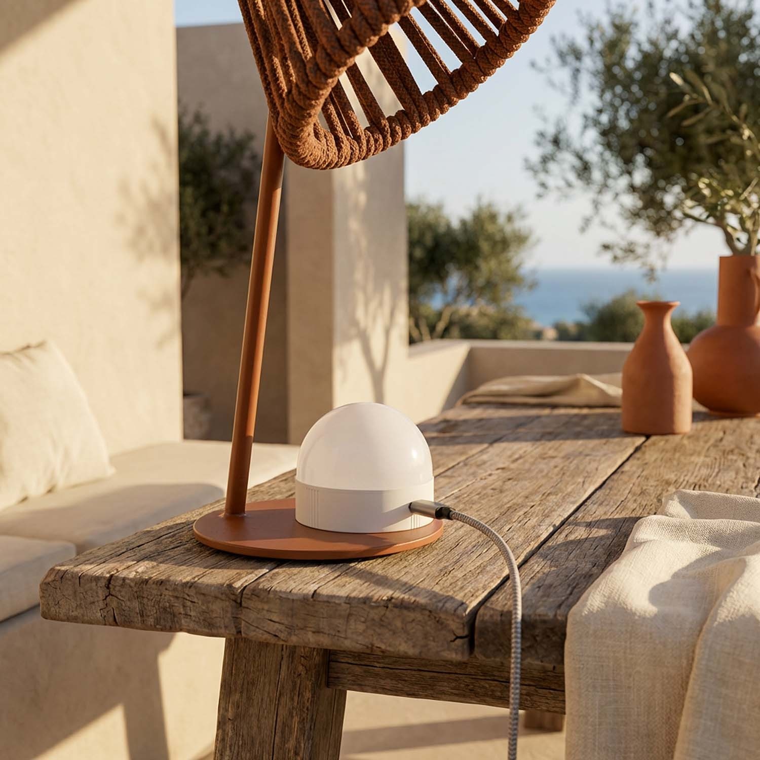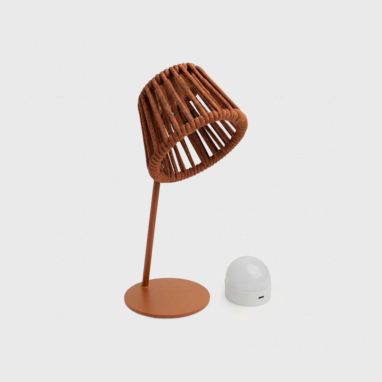 Mini Ropelle je nabíjecí stolní lampa bez kabelů s ručně pleteným lanem z olefinového polypropylenu – materiálu ideálního pro venkovní použití, který nebledne a odolává dešti, slunci i slané vodě. Magnetická žárovka Mag se jedním pohybem odejme a nabíjí se přes USB-C samostatně, bez nutnosti lampu přemisťovat. Pro zahrady, terasy, obývací pokoje i pracovní stoly: atmosférické světlo bez kabelů, které si najde místo i na českých terasách.