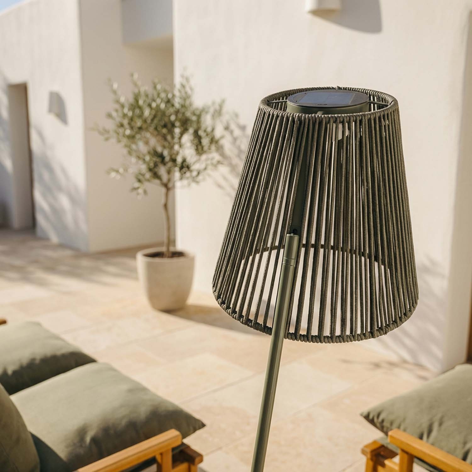 Ropelle je venkovní solární lampa o výšce 160 cm, s pleteným lanem z polypropylenu olefin, materiálu obzvlášť vhodného pro outdoorové produkty, který večer vytváří jedinečnou hru světla a stínů. Solární panel ji dobíjí během dne; soumrakový senzor ji zapne při západu slunce a vypne při svítání, zcela automaticky. Ideální pro zahrady, terasy i jakýkoli venkovní prostor, kde chcete vytvořit atmosféru bez elektrikáře a bez nákladů na energii.