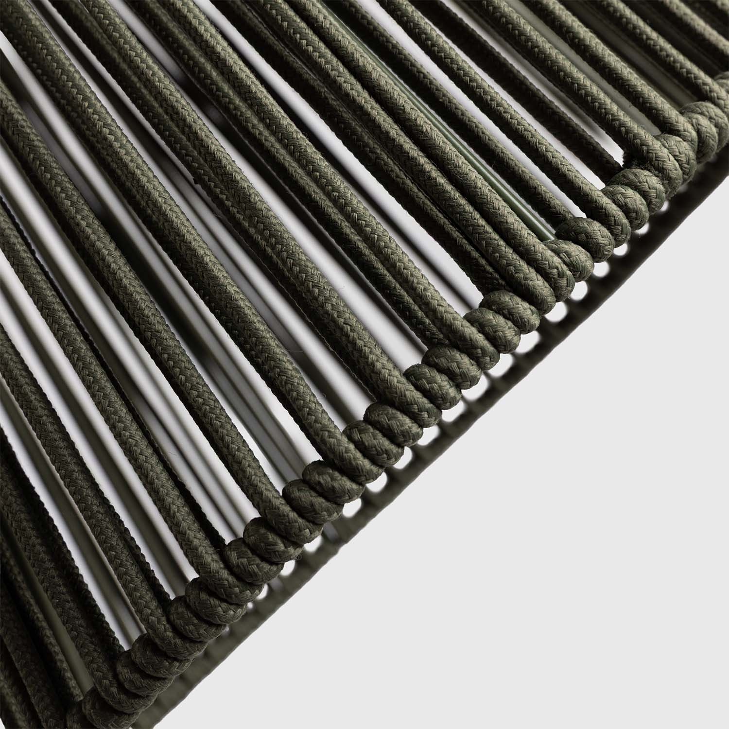 Lano není jen estetický prvek: je vyrobeno z polypropylenového olefinu, syntetického vlákna odolného vůči UV záření, antimykotického, rychleschnoucího a ze 100 % recyklovatelného. Když se Ropelle rozsvítí, proplétaná struktura promítá radiální vzor teplých stínů na okolní povrchy. Scénický efekt, který zdobí prostor.