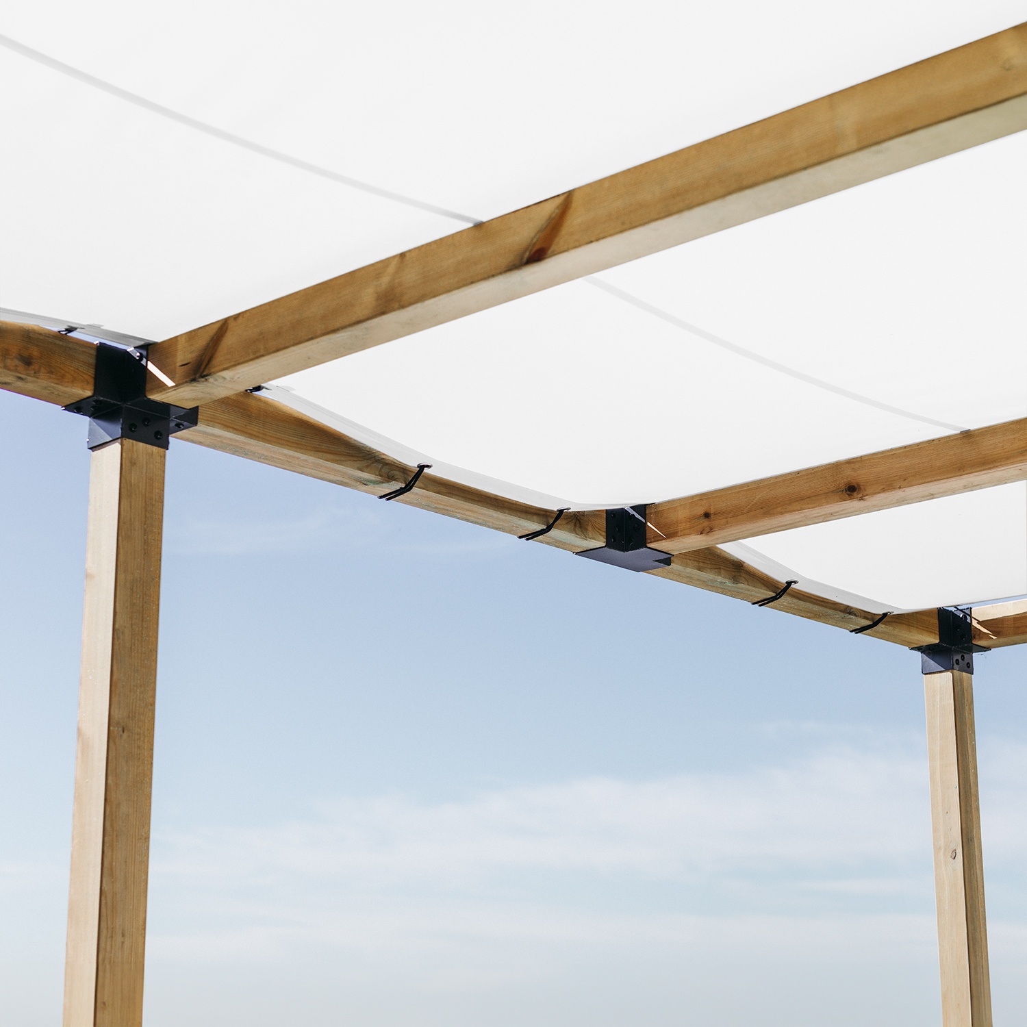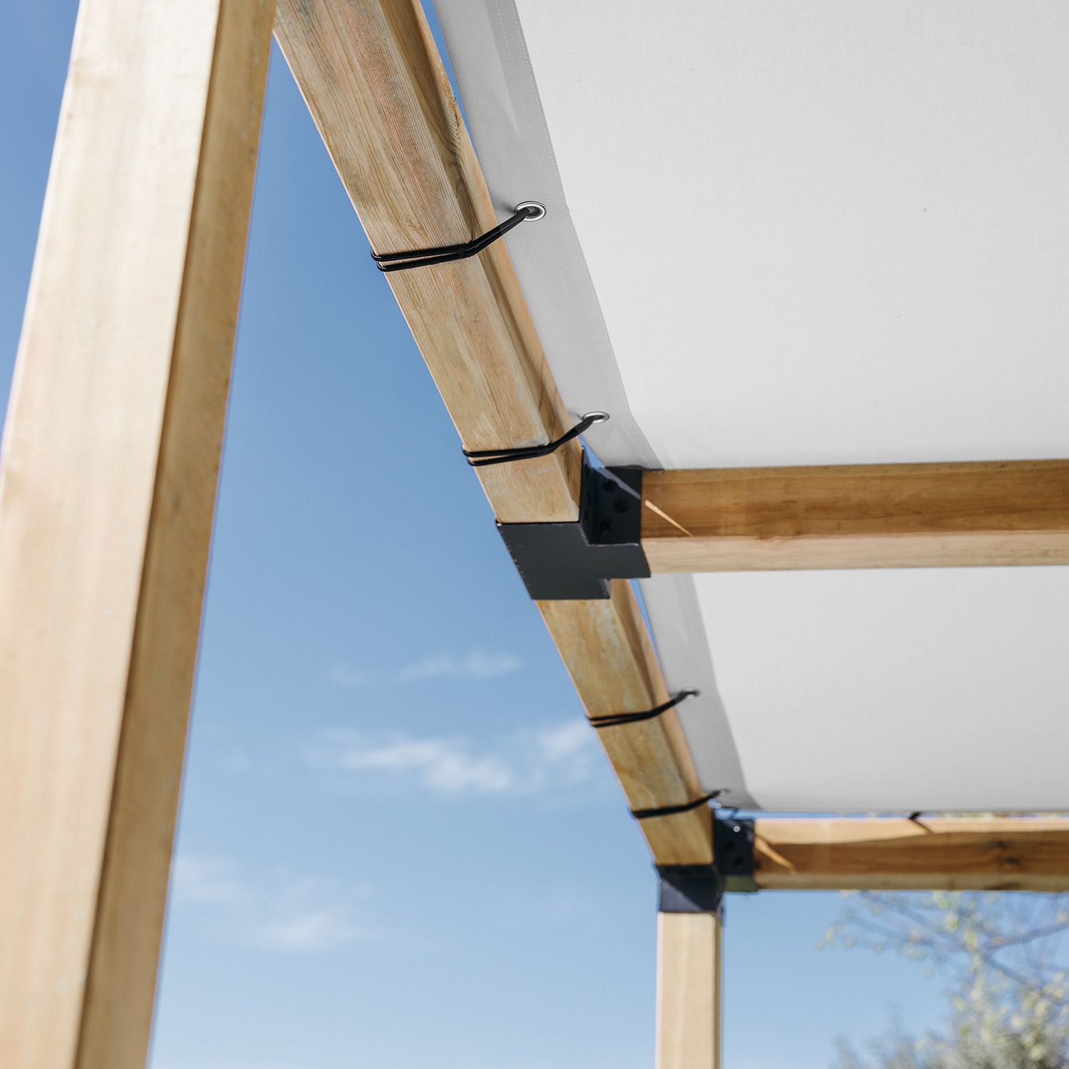 Knoflíky lze připevnit k horní části obvodových trámů pergoly. Použití tohoto řešení zajišťuje úhlednější a čistší vzhled, protože upevňovací systém není pro uživatele pergoly viditelný.