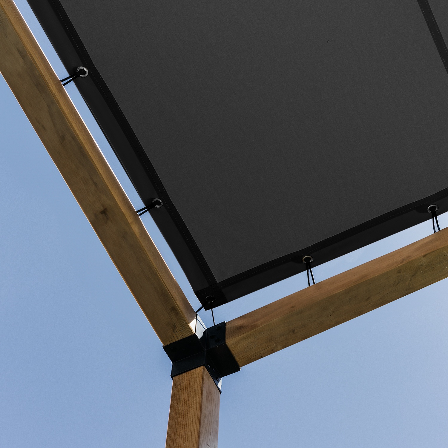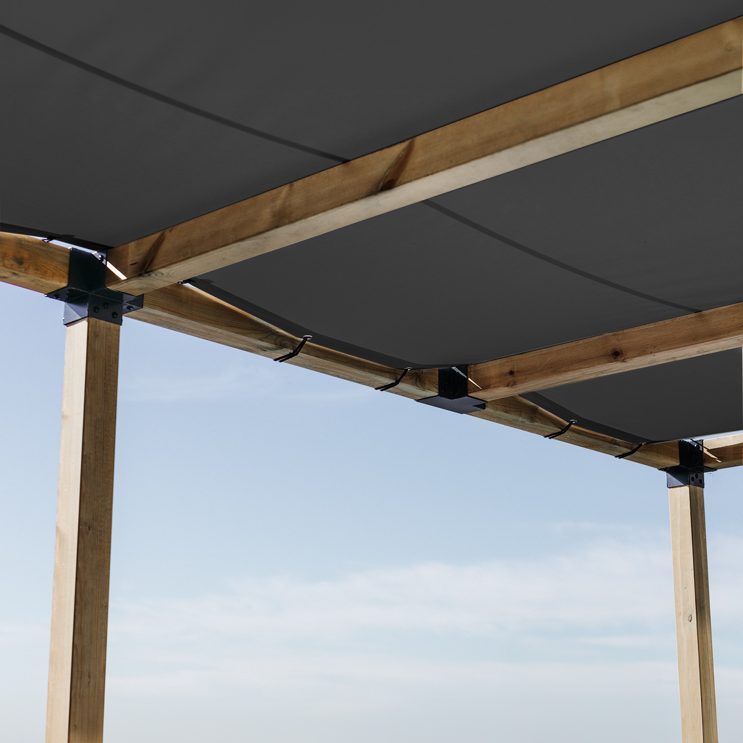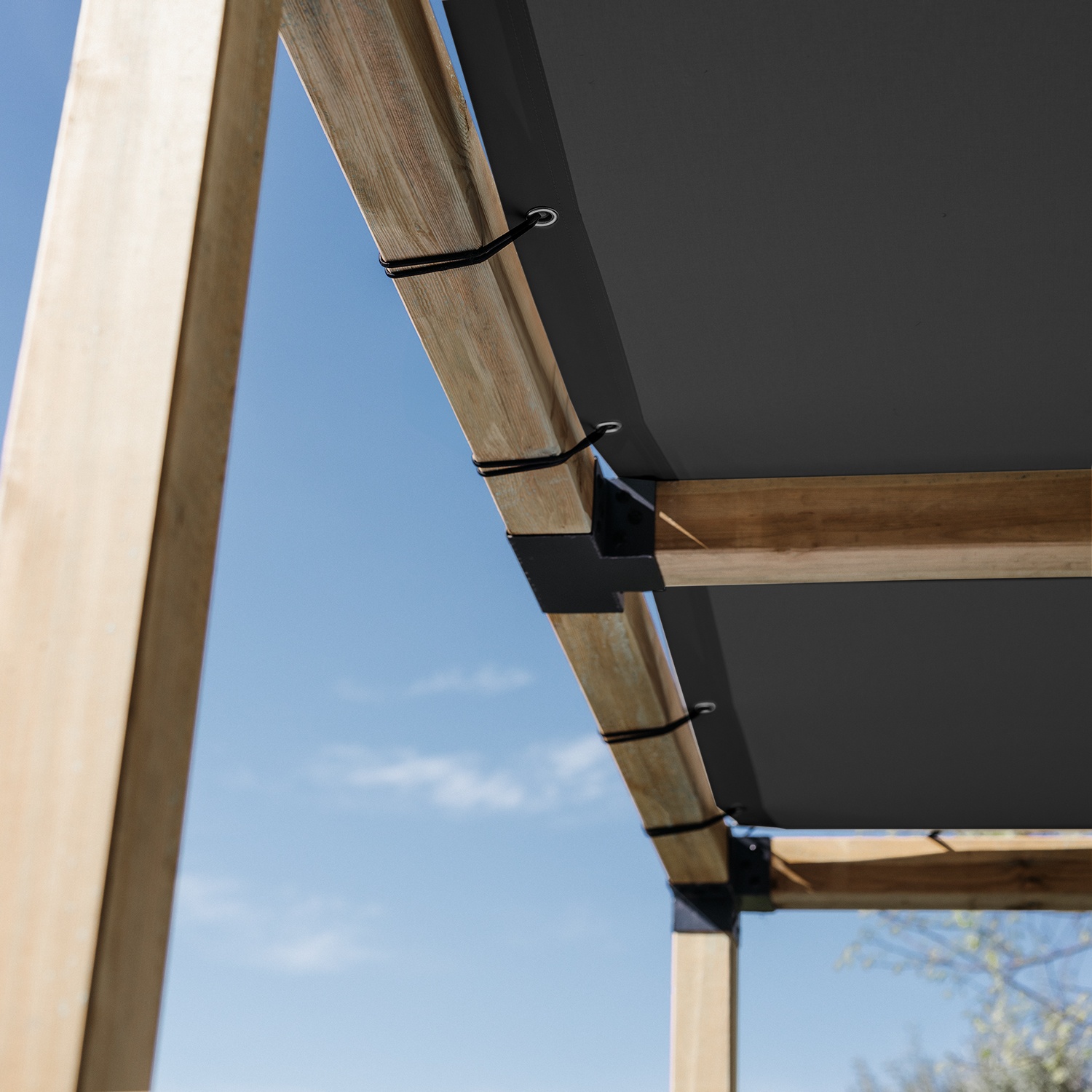 Knoflíky lze připevnit k horní části obvodových trámů pergoly. Použití tohoto řešení zajišťuje úhlednější a čistší vzhled, protože upevňovací systém není pro uživatele pergoly viditelný.