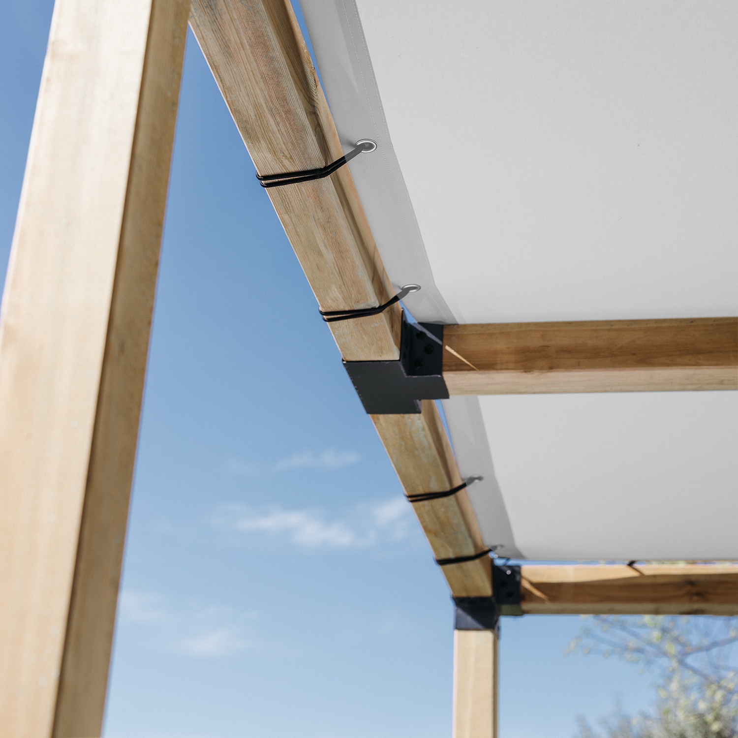 Knoflíky lze připevnit k horní části obvodových trámů pergoly. Použití tohoto řešení zajišťuje úhlednější a čistší vzhled, protože upevňovací systém není pro uživatele pergoly viditelný.