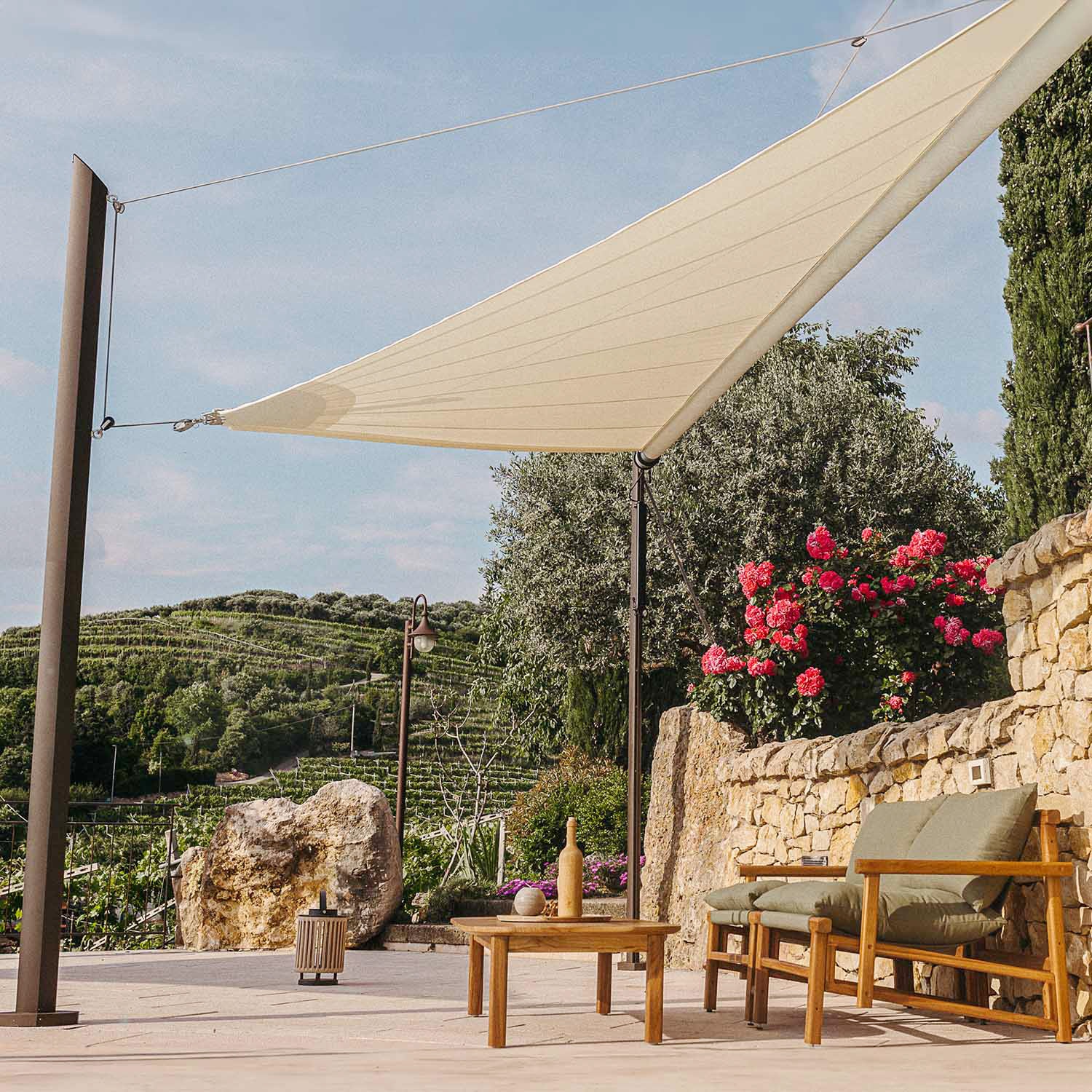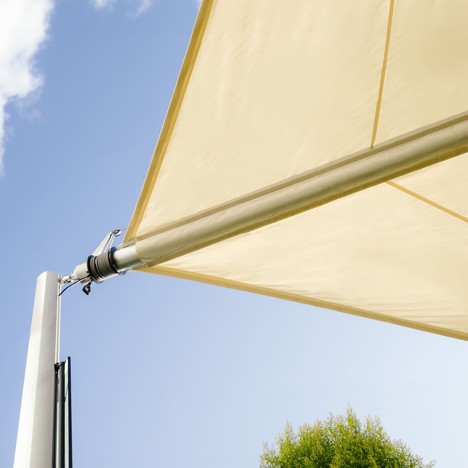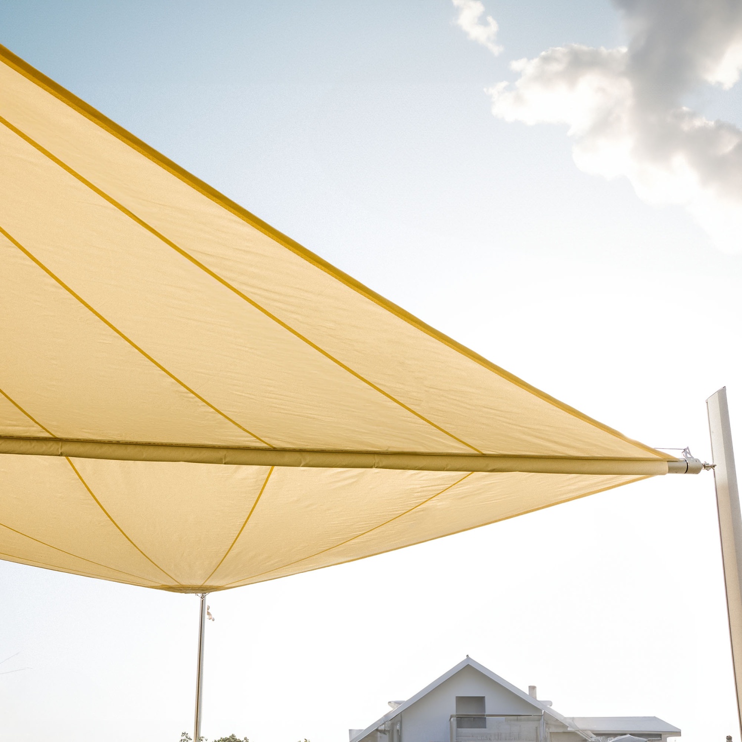 Motorizovaná sluneční plachta Zefira může zůstat nainstalovaná po celý rok. Nerezová ocel a tkanina Purishade® odolávají dešti, mrazu i dalším povětrnostním vlivům. Značka Maanta navrhuje automatické rolovací plachty, které vydrží dlouhá léta. Sezónní demontáž je doporučená, ale ne nezbytná.
