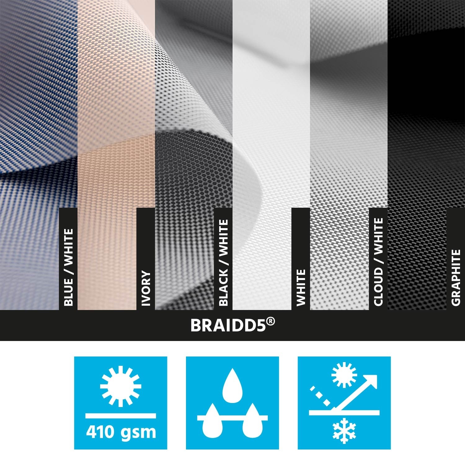 Naše technická tkanina Braidd5® z polyesteru a PVC je ideální pro ty, kteří hledají prodyšný odstín s elegantní vazbou a vysokou pevností.