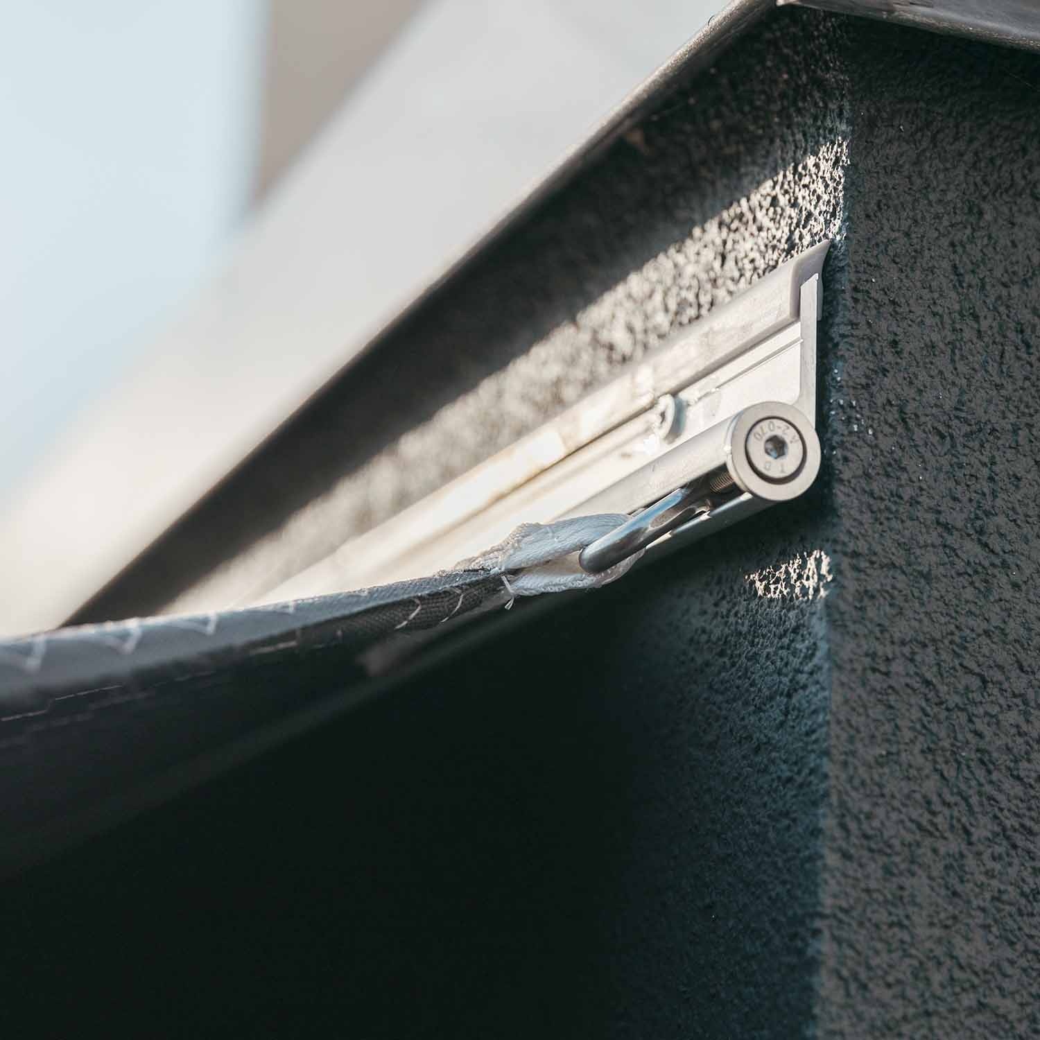 Hliníkový profil upevněný na celé straně plachty nepropouští dešťovou vodu mezi plachtou a stěnou.