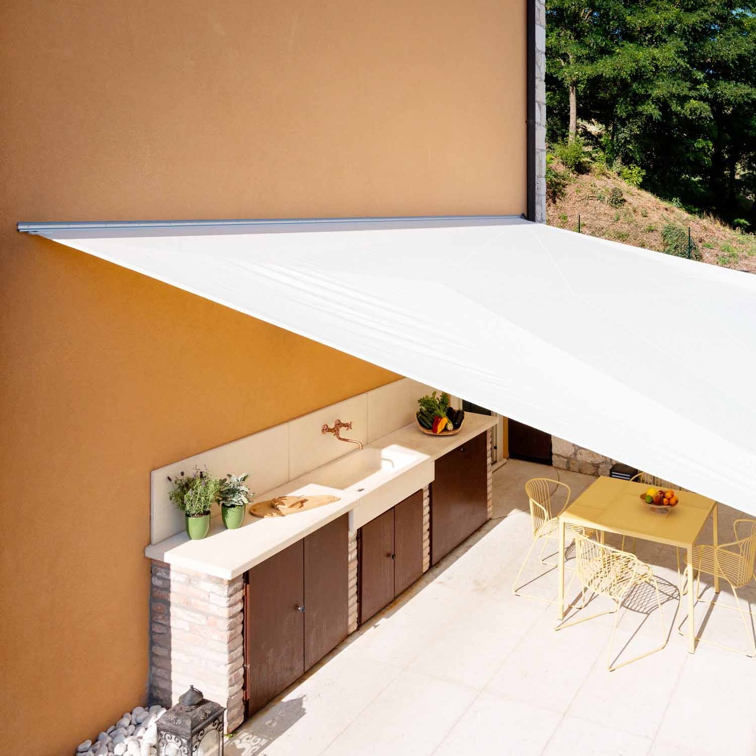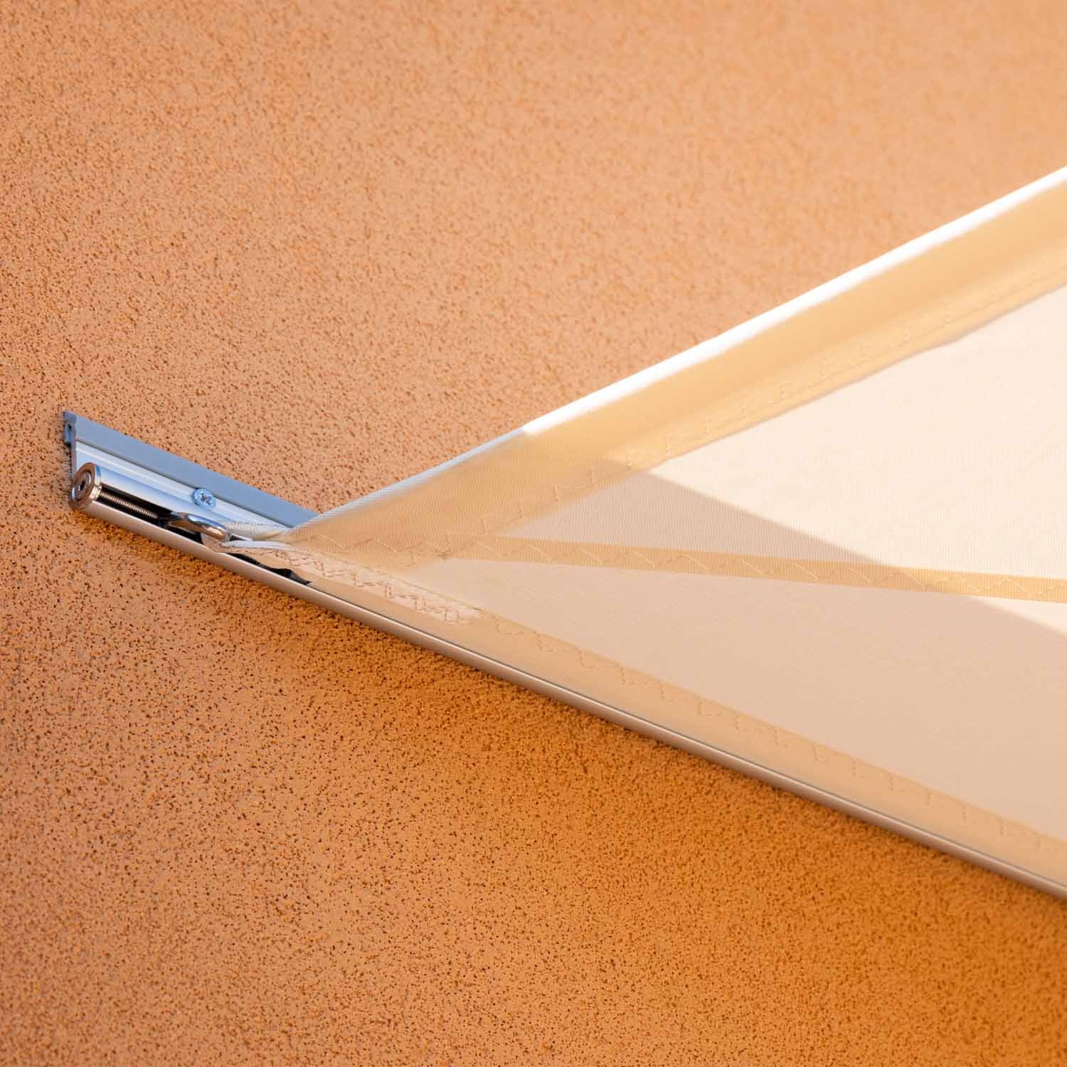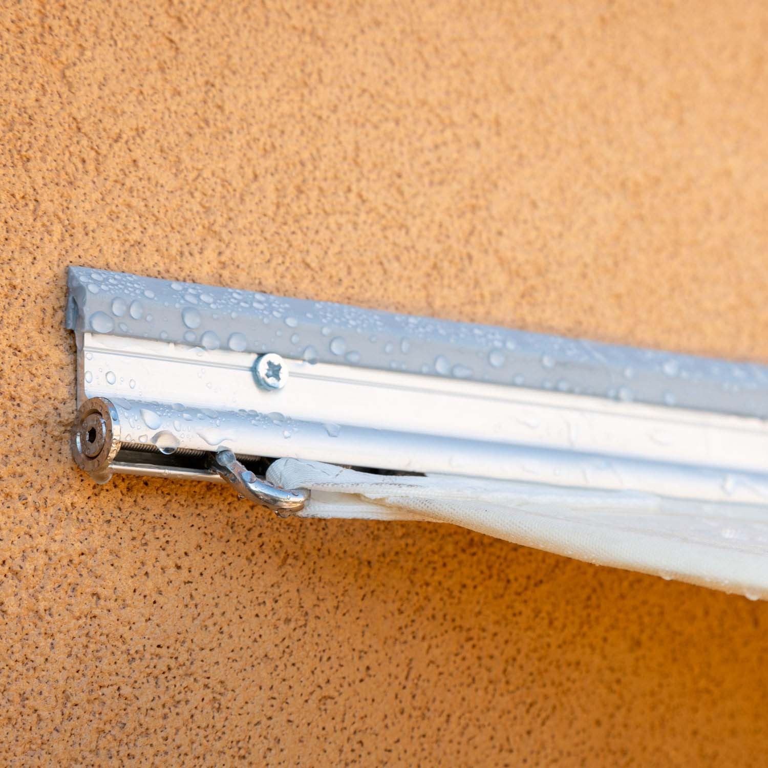 Ukotvení celé strany plachty k vnější stěně tak zaručuje úplnou ochranu před kapáním a maximální pohodlí i za silného deště.