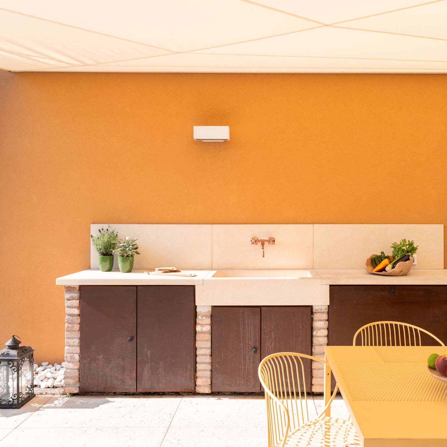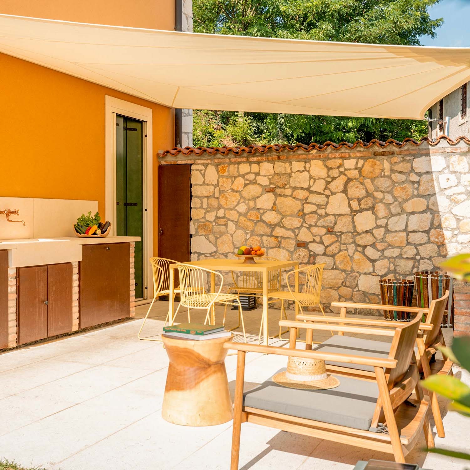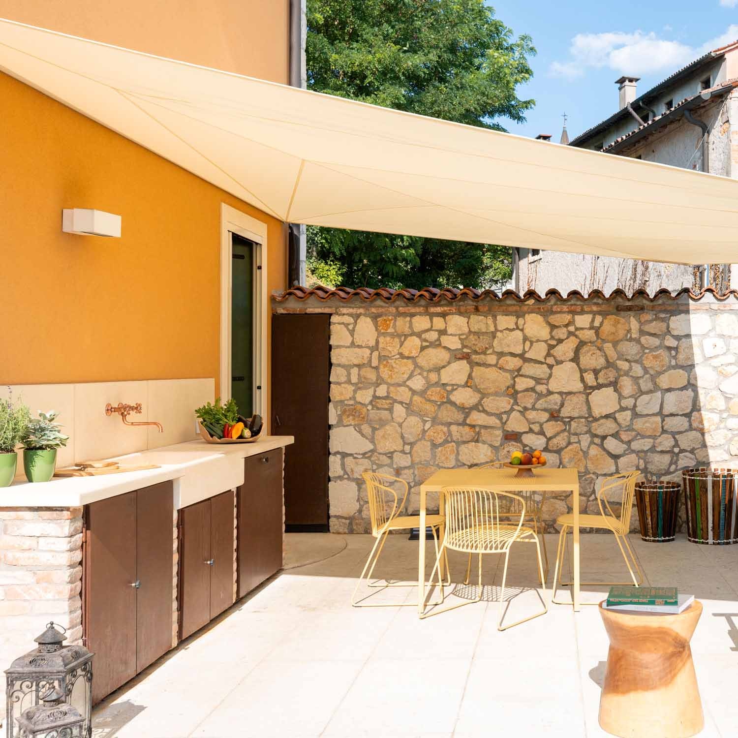 Ukotvení celé strany plachty k vnější stěně tak zaručuje úplnou ochranu před kapáním a maximální pohodlí i za silného deště.