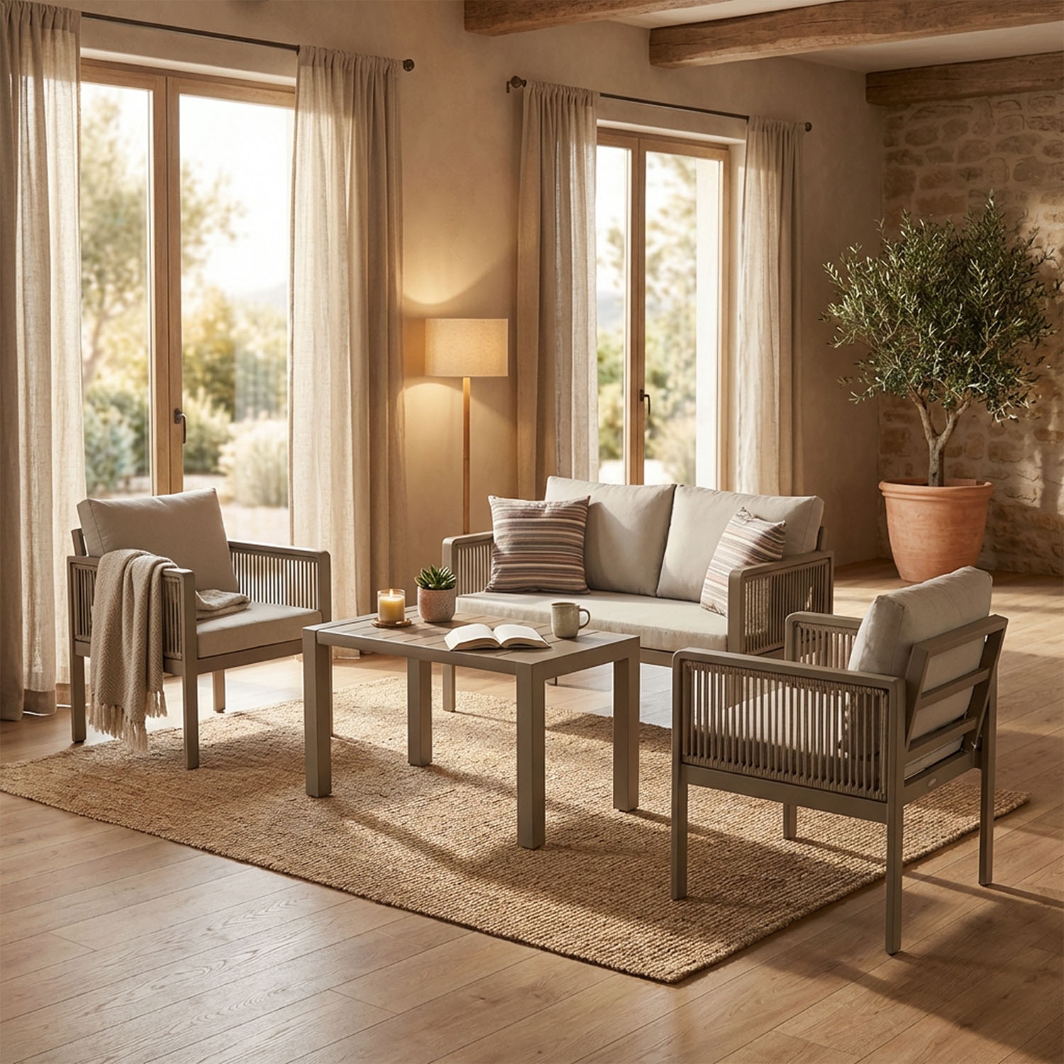 Ano. Odstín taupe a lano v neutrální barvě dělají model Genova vhodným i pro verandy, kryté terasy a interiéry. Není potřeba žádná samostatná verze: jde o stejnou sadu pro oba způsoby použití.