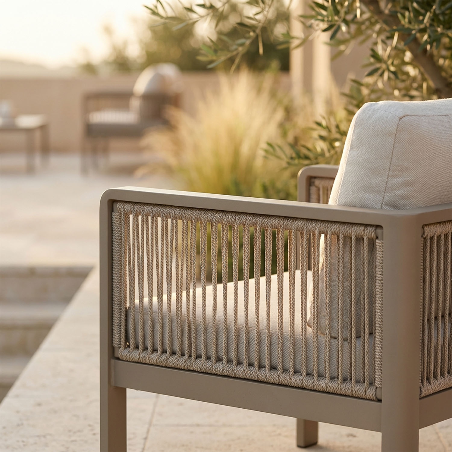 Ostrov pohodlí v zeleni: ručně pletené olefinové lano se vizuálně přirozeně propojuje s vegetací a přírodními povrchy. Set odolává UV záření bez vyblednutí – zůstává krásný i po intenzivních létech.