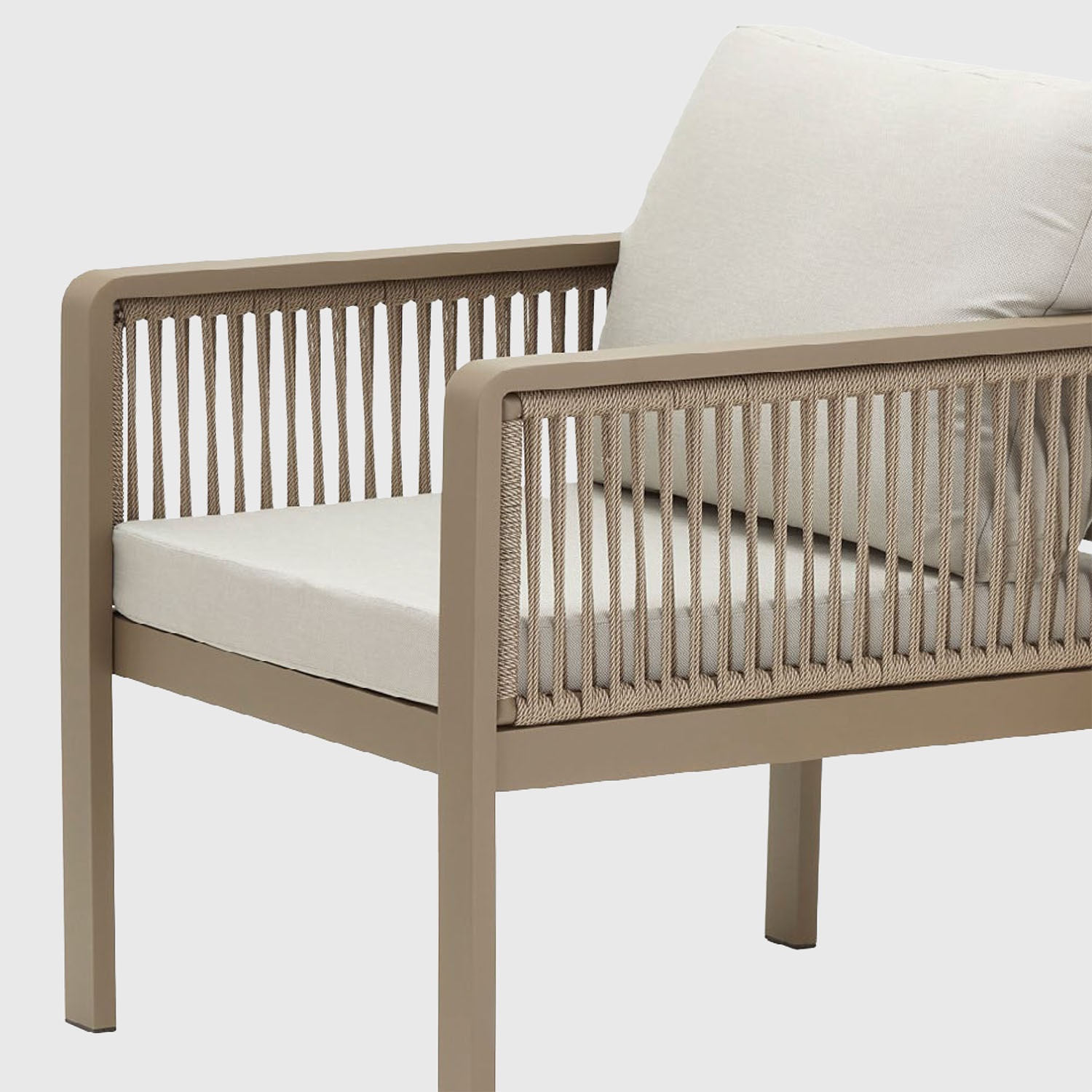 Konstrukce z hliníku v barvě taupe s ručně pleteným olefinovým lanem. Rozměry 130×67×74 cm. Součástí je sedací a opěrný polštář z Olefinu v pískové barvě.